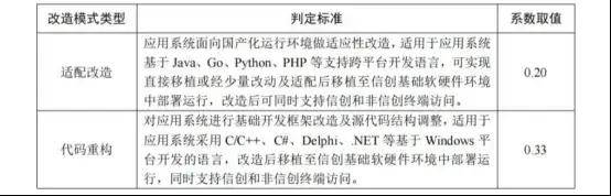 根据应用系统国产化改造的技术复杂度进行分类,分为系统适配改造、代码重构两类,并设置相应的系数取值,具体如下表所示: